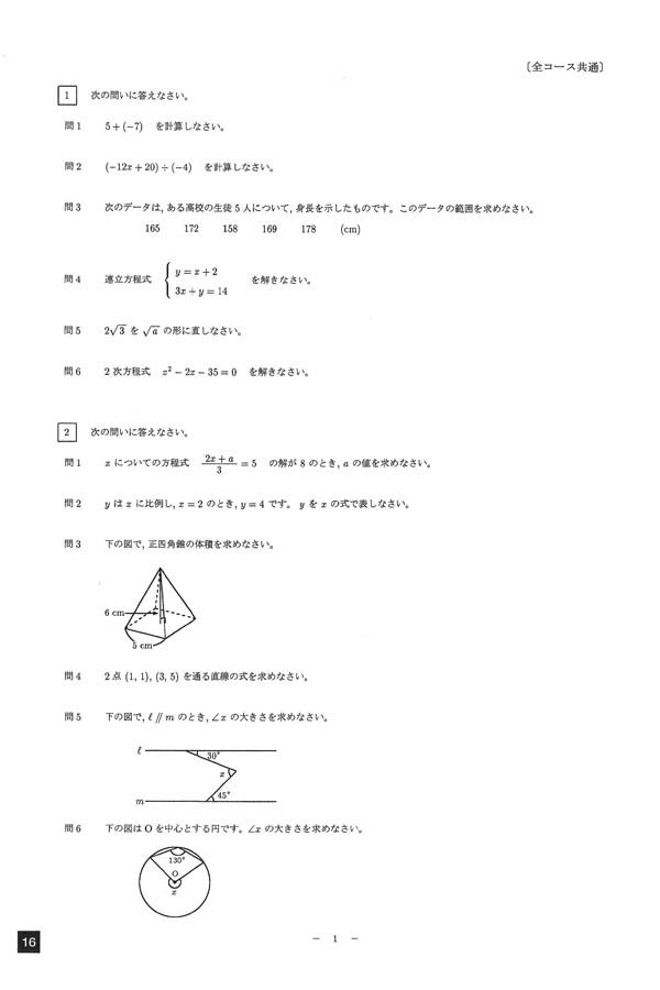 2023年度入試過去問題 特進コース(数学 問題)(1ページ目)|札幌龍谷学園高等学校の入試過去問