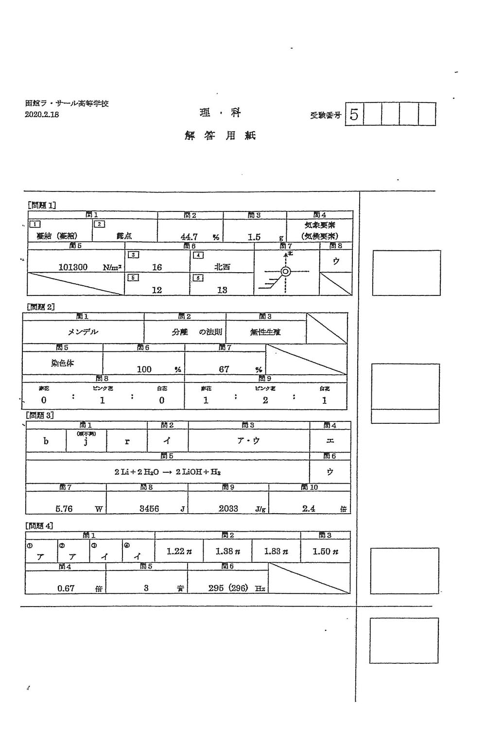 2020年度入試過去問題 一般(理科 解答)(1ページ目)|函館ラ・サール高等学校の入試過去問