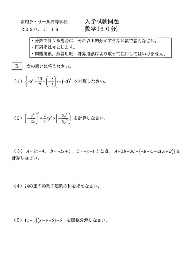 2020年度入試過去問題 推薦(数学 問題)(1ページ目)|函館ラ・サール高等学校の入試過去問