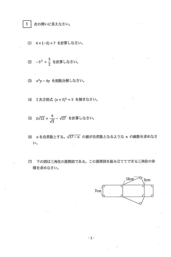 2023年度入試過去問題(数学 問題)(1ページ目)|旭川藤星高等学校の入試過去問