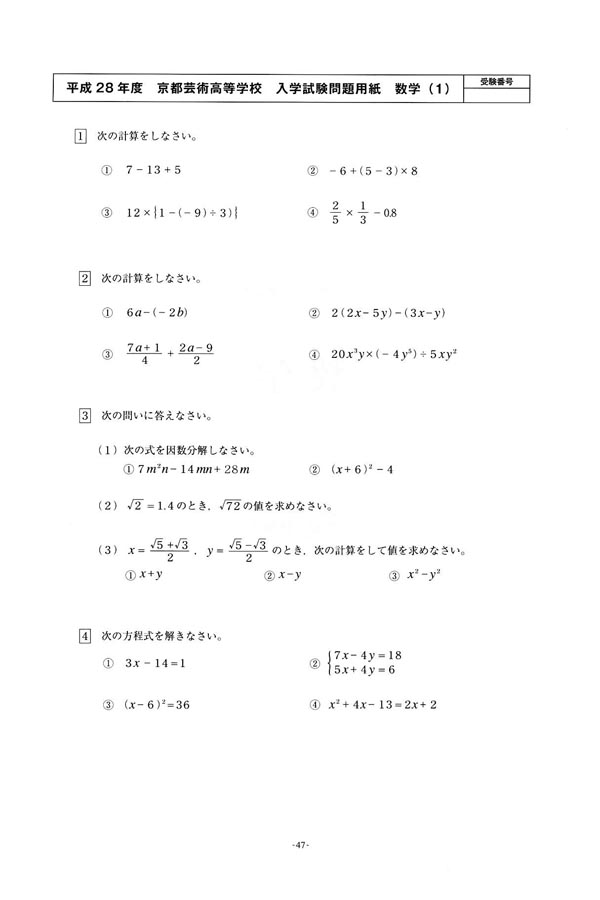 平成28年度入試過去問題(数学 問題)(1ページ目)|京都芸術高等学校の入試過去問