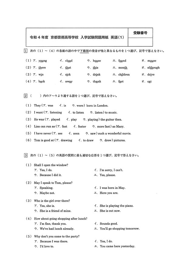 2022年度入試過去問題(英語 問題)(1ページ目)|京都芸術高等学校の入試過去問