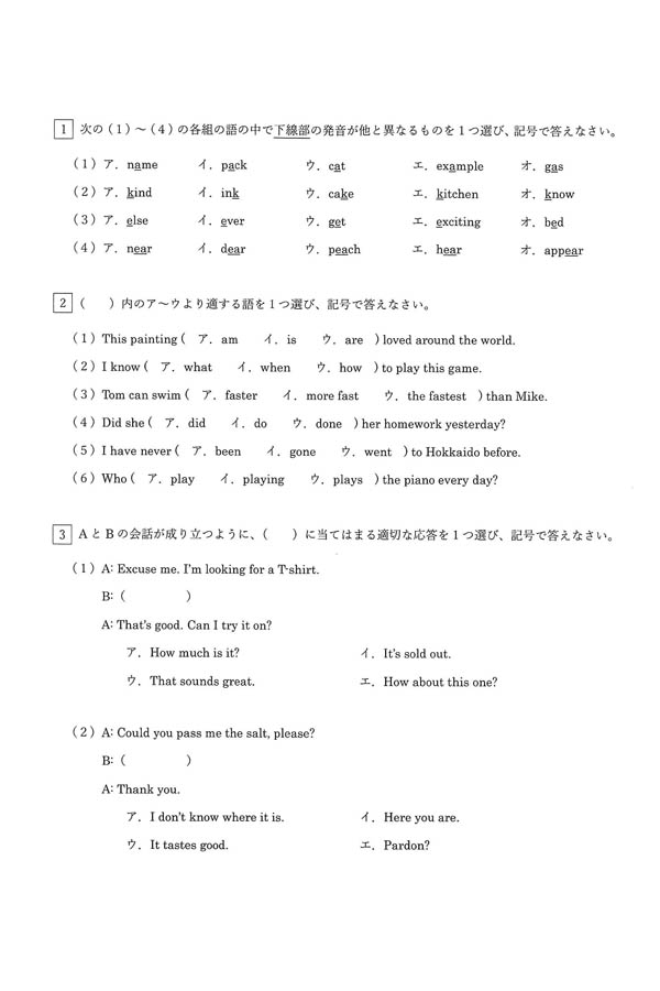 2024年度入試過去問題 専願A・併願A(英語 問題)(1ページ目)|京都芸術高等学校の入試過去問