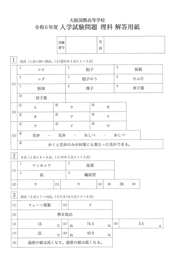 2024年度入試過去問題(理科 解答)(1ページ目)|大阪国際高等学校の入試過去問