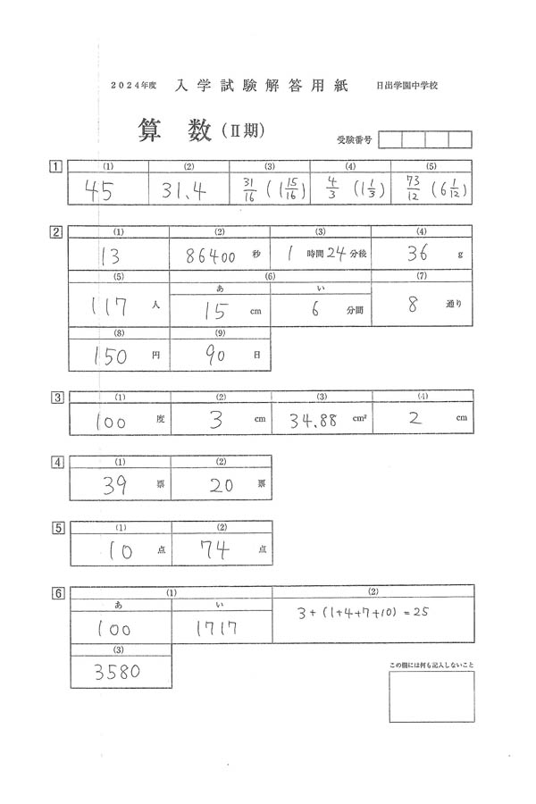 2024年度入試過去問題   II 期(算数 解答)(1ページ目)|日出学園中学校の入試過去問