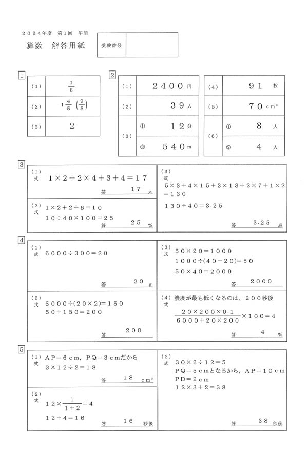 2024年度入試過去問題  第1回午前(算数 解答)(1ページ目)|三輪田学園中学校の入試過去問