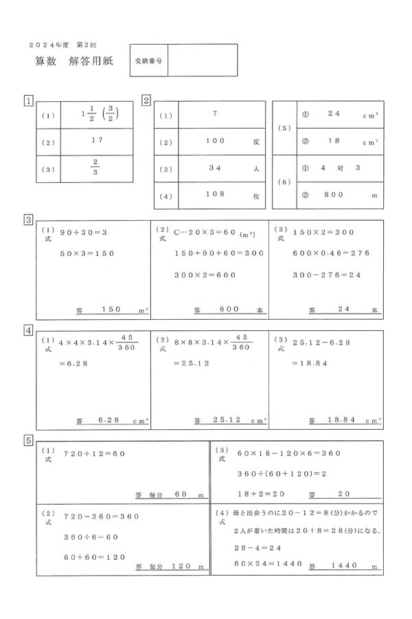 2024年度入試過去問題  第2回(算数 解答)(1ページ目)|三輪田学園中学校の入試過去問