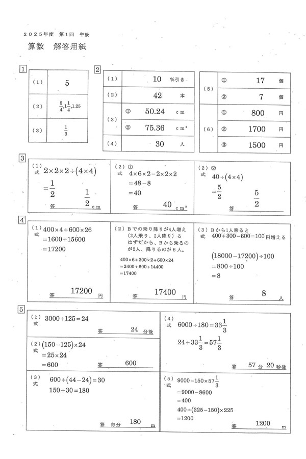 2025年度入試過去問題  第1回午後(算数 解答)(1ページ目)|三輪田学園中学校の入試過去問