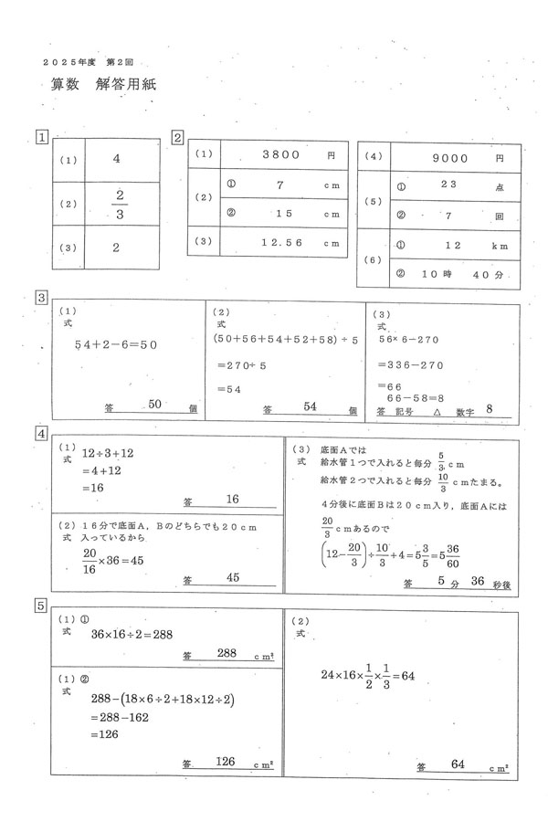 2025年度入試過去問題  第2回(算数 解答)(1ページ目)|三輪田学園中学校の入試過去問