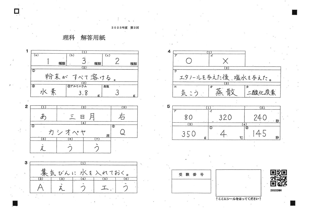 2025年度入試過去問題  第2回(理科 解答)(1ページ目)|三輪田学園中学校の入試過去問