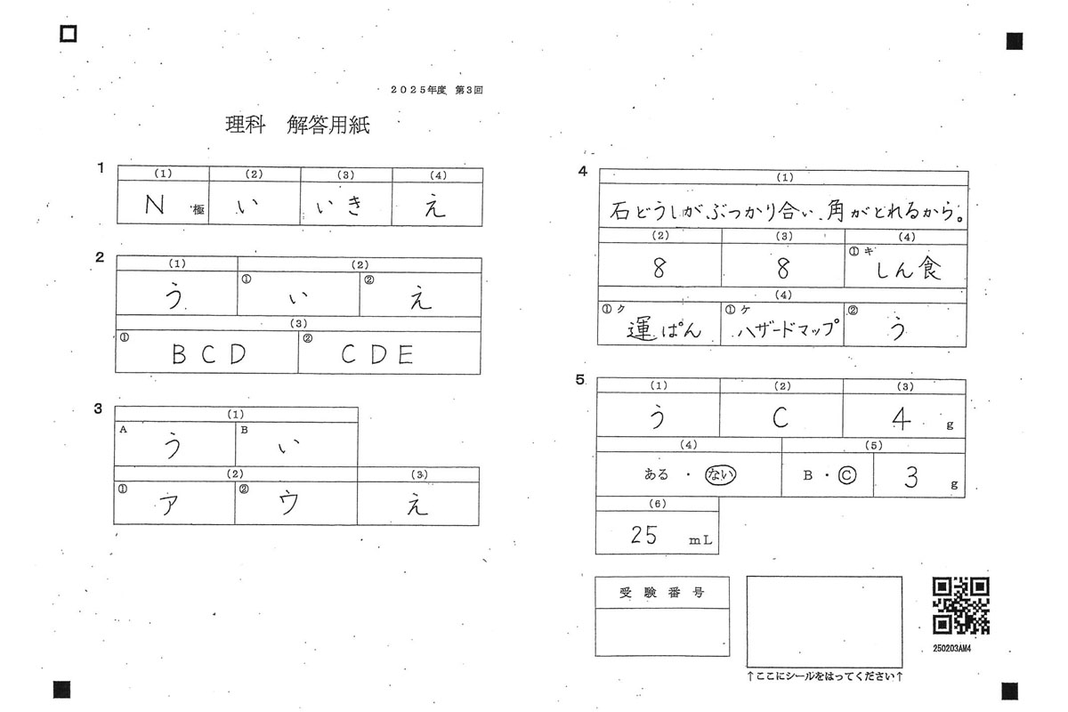 2025年度入試過去問題  第3回(理科 解答)(1ページ目)|三輪田学園中学校の入試過去問