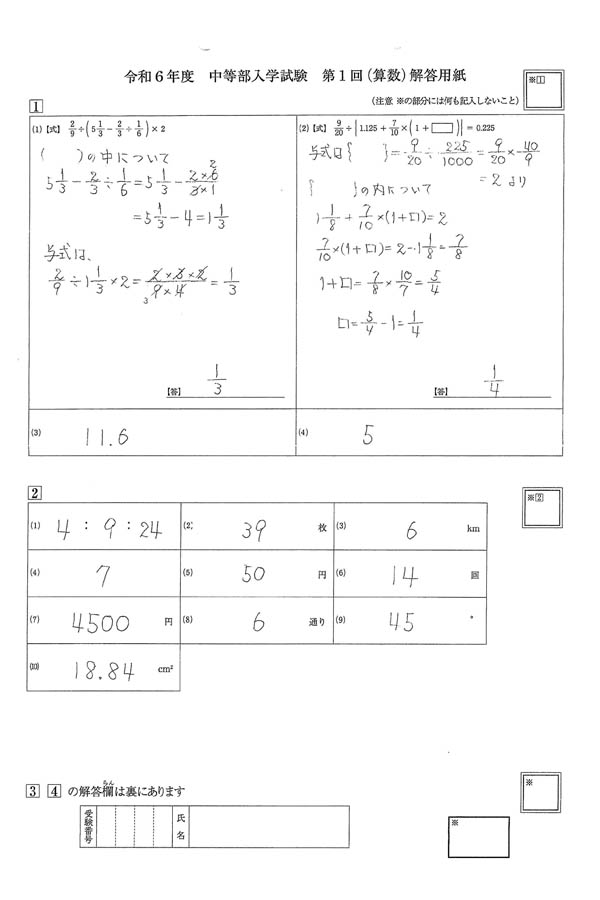 2024年度入試過去問題 第1回(算数 解答)(1ページ目)|品川女子学院中等部の入試過去問