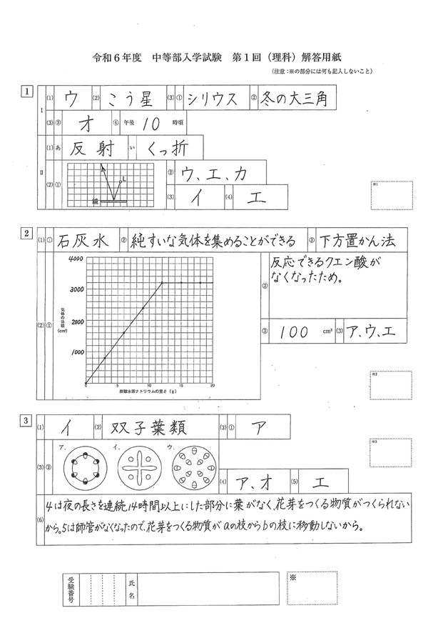2024年度入試過去問題 第1回(理科 解答)(1ページ目)|品川女子学院中等部の入試過去問