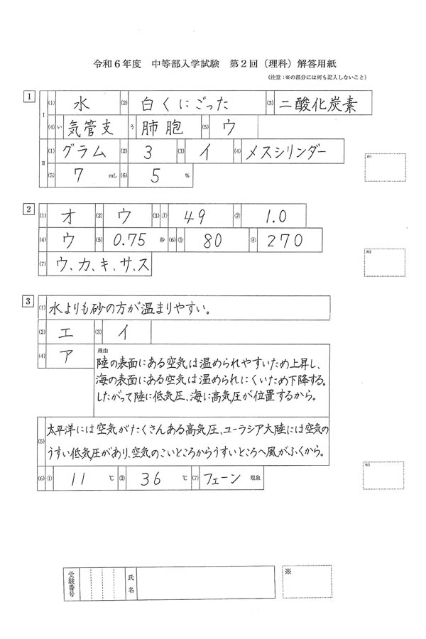 2024年度入試過去問題 第2回(理科 解答)(1ページ目)|品川女子学院中等部の入試過去問