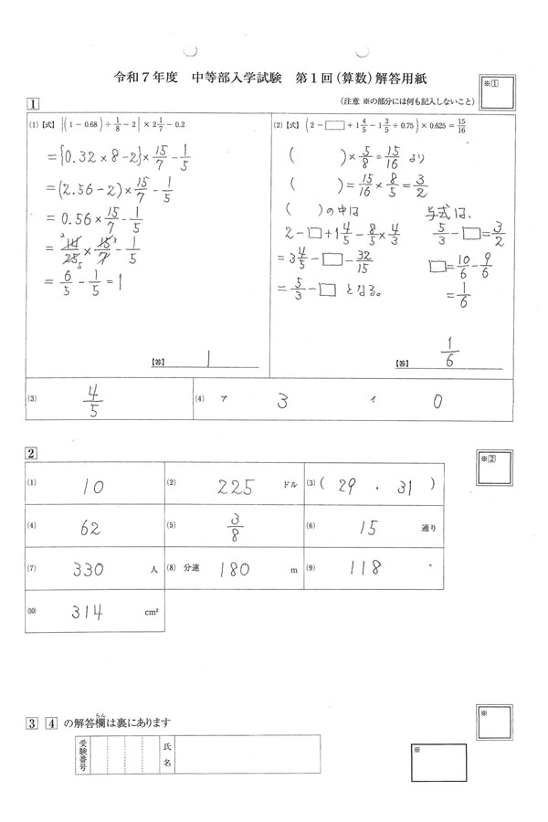 令和7年度入試過去問題 第1回(算数 解答)(1ページ目)|品川女子学院中等部の入試過去問