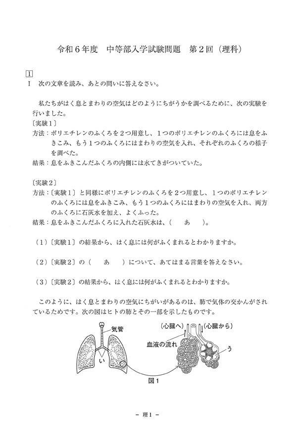 2024年度入試過去問題 第2回(理科 問題)(1ページ目)|品川女子学院中等部の入試過去問