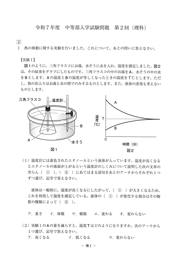令和7年度入試過去問題 第2回(理科 問題)(1ページ目)|品川女子学院中等部の入試過去問