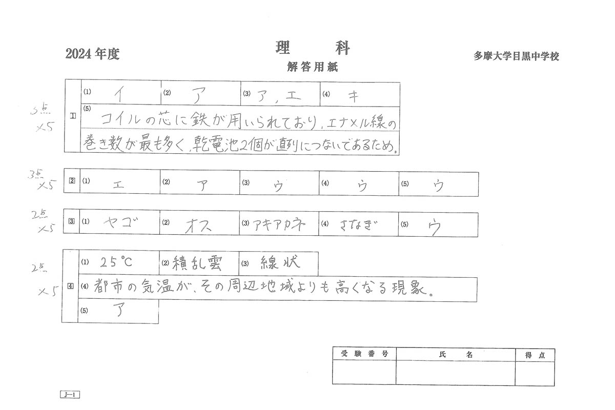 2024年度入試過去問題  J-1(理科 解答)(1ページ目)|多摩大学目黒中学校の入試過去問