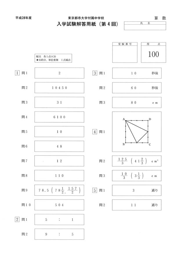 平成29年度入試過去問題 一般入試 第4回(算数 解答)(1ページ目)|東京都市大学付属中学校の入試過去問