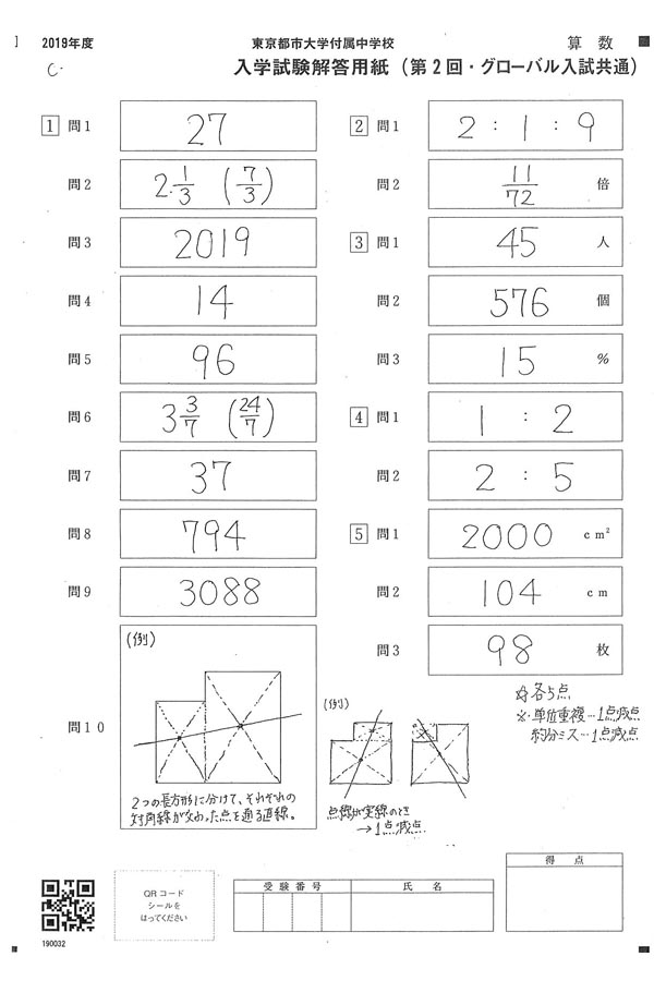 平成31年度入試過去問題 第2回(算数 解答)(1ページ目)|東京都市大学付属中学校の入試過去問