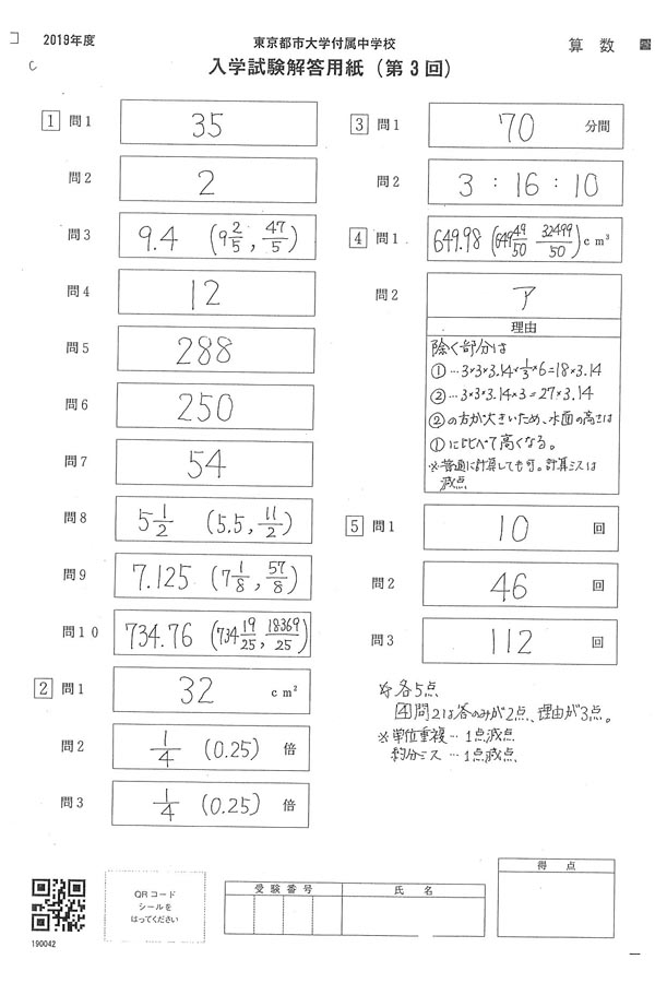平成31年度入試過去問題 第3回(算数 解答)(1ページ目)|東京都市大学付属中学校の入試過去問