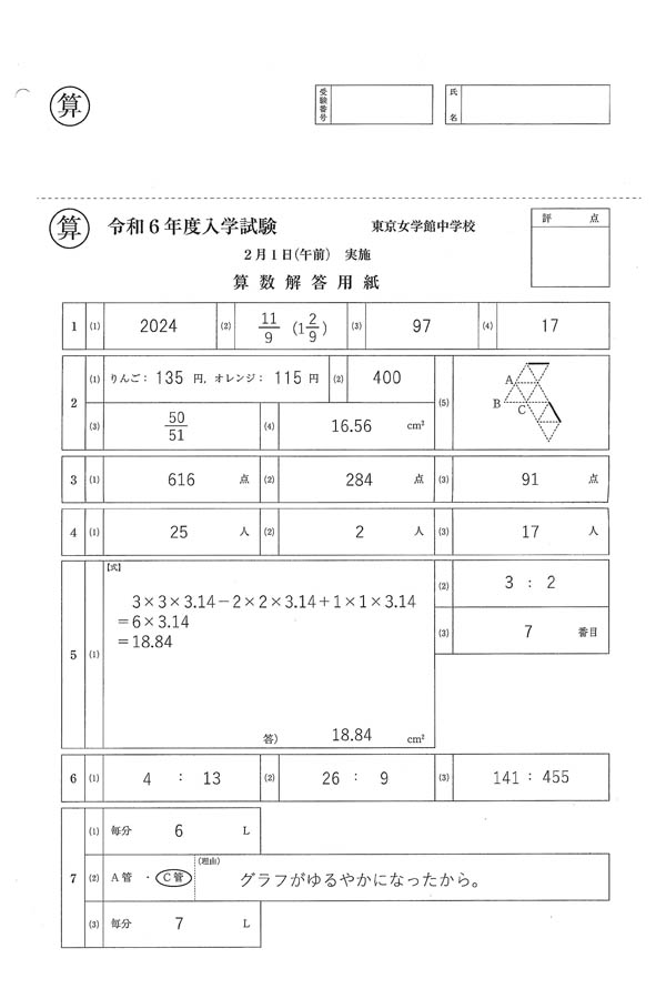 令和6年度年度入試過去問題 2月1日(午前) (算数 解答)(1ページ目)|東京女学館中学校の入試過去問