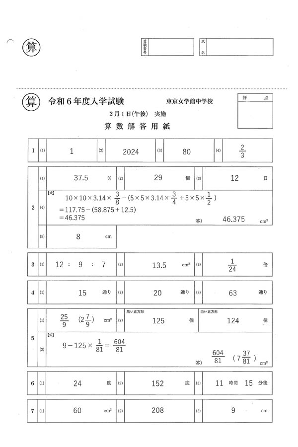 令和6年度年度入試過去問題 2月1日(午後)(算数 解答)(1ページ目)|東京女学館中学校の入試過去問