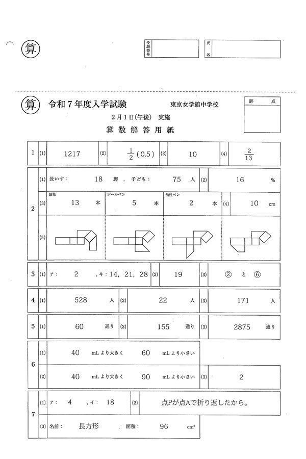 令和7年度入試過去問題 2月1日(午後) (算数 解答)(1ページ目)|東京女学館中学校の入試過去問