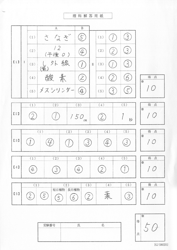 平成20年度入試過去問題 第2回入試(理科 解答)(1ページ目)|国学院大学久我山中学校の入試過去問