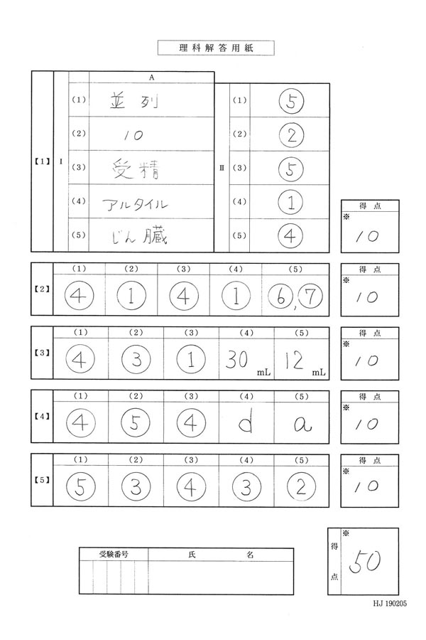 平成31年度入試過去問題 第3回(理科 解答)(1ページ目)|国学院大学久我山中学校の入試過去問