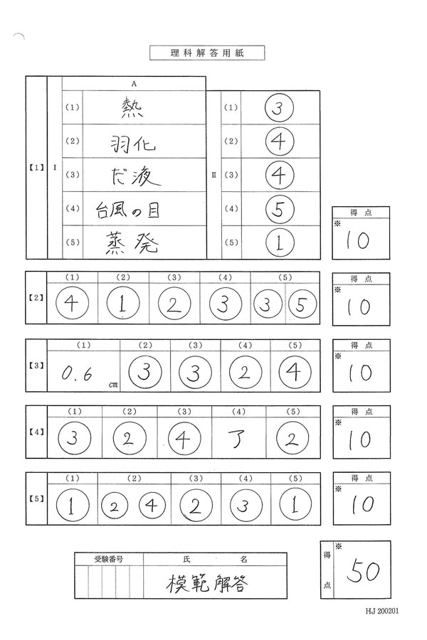 2020年度入試過去問題 第1回(理科 解答)(1ページ目)|国学院大学久我山中学校の入試過去問