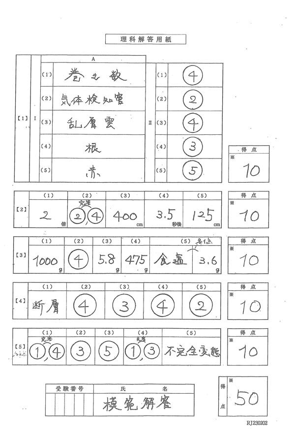 2023年度入試過去問題 第2回(理科 解答)(1ページ目)|国学院大学久我山中学校の入試過去問