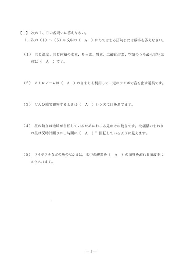 2021年度入試過去問題  第1回(理科 問題)(1ページ目)|国学院大学久我山中学校の入試過去問