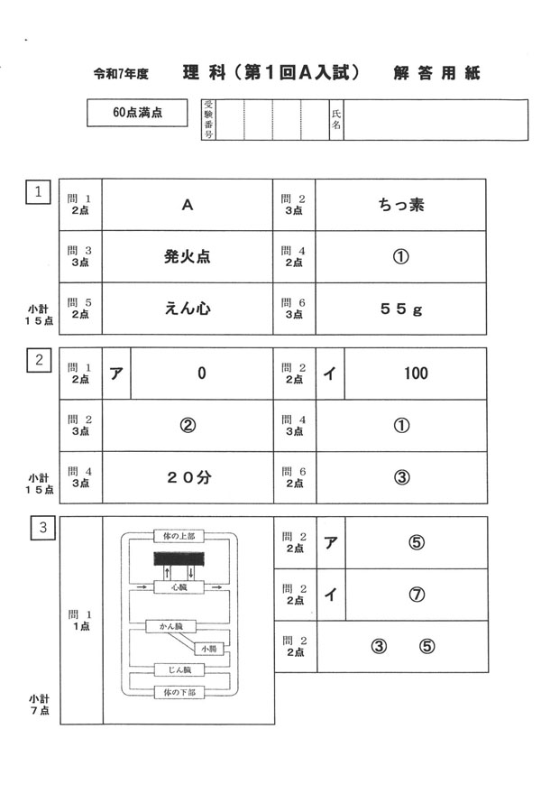令和7年度入試過去問題  第1回A(理科 解答)(1ページ目)|順天中学校の入試過去問