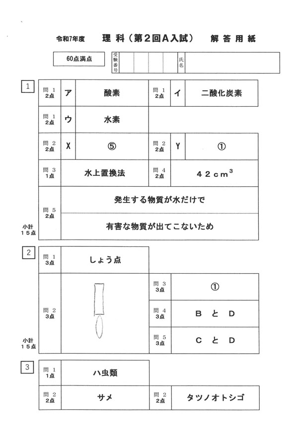令和7年度入試過去問題  第2回A(理科 解答)(1ページ目)|順天中学校の入試過去問