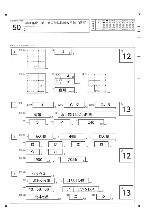 2024年度入試過去問題  第1回(理科 解答)(1ページ目)|晃華学園中学校の入試過去問