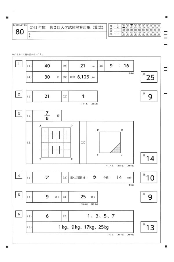 2024年度入試過去問題  第2回(算数 解答)(1ページ目)|晃華学園中学校の入試過去問