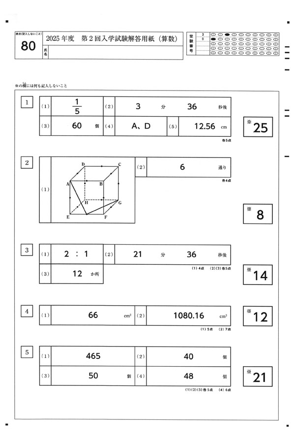 2025年度入試過去問題 第2回(算数 解答)(1ページ目)|晃華学園中学校の入試過去問