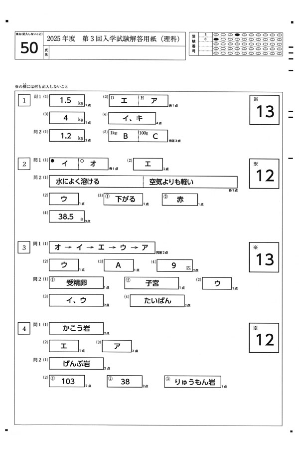 2025年度入試過去問題 第3回(理科 解答)(1ページ目)|晃華学園中学校の入試過去問