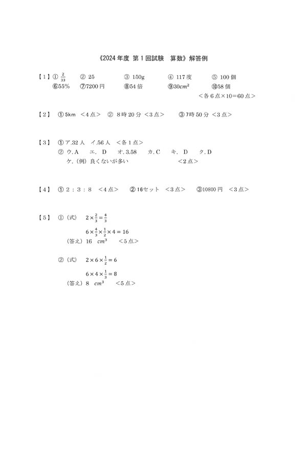 2024年度入試過去問題  第1回(算数 解答)(1ページ目)|カリタス女子中学校の入試過去問