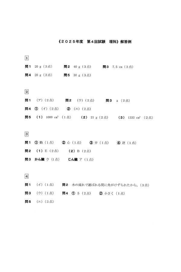 2025年度入試過去問題  第4回(理科 解答)(1ページ目)|カリタス女子中学校の入試過去問