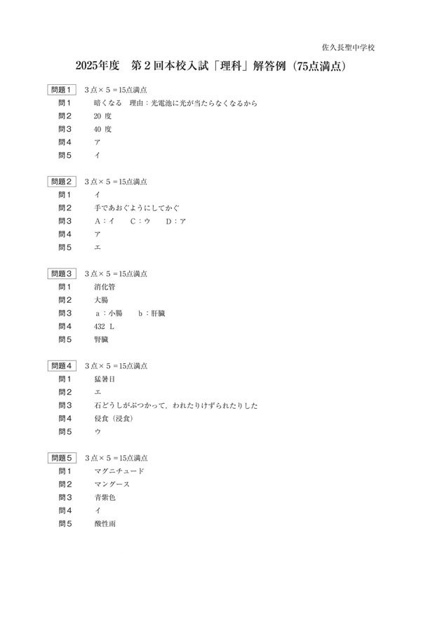 2025年度入試過去問題 本校2(理科 解答)(1ページ目)|佐久長聖中学校の入試過去問