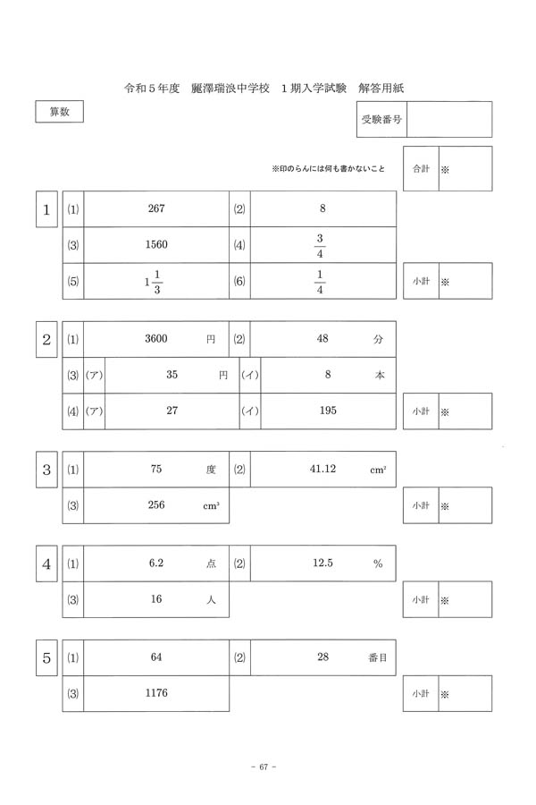 令和5年度入試過去問題 1期(算数 解答)(1ページ目)|麗澤瑞浪中学校の入試過去問