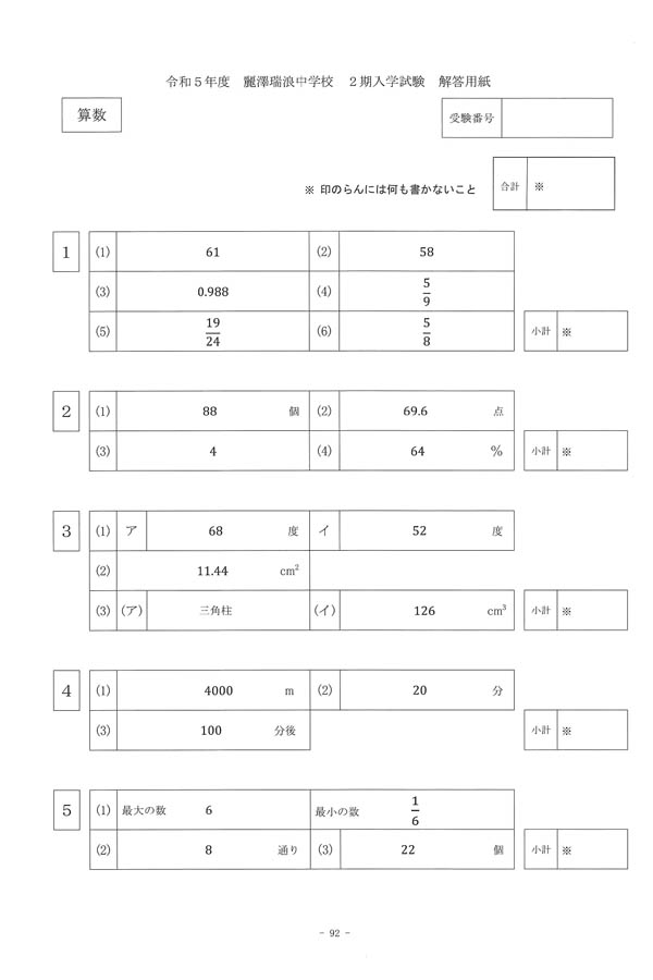 令和5年度入試過去問題 2期(算数 解答)(1ページ目)|麗澤瑞浪中学校の入試過去問