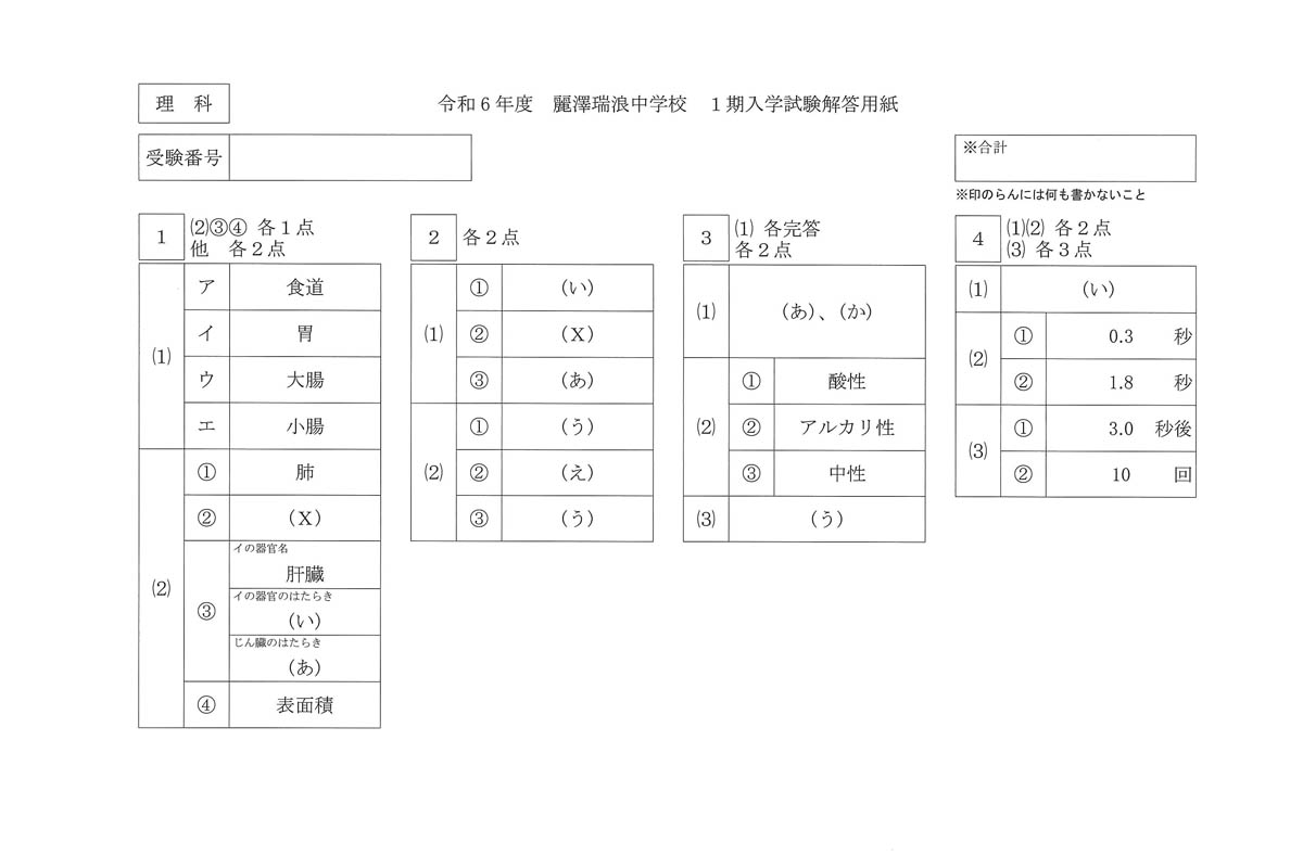 令和6年度入試過去問題 1期(理科 解答)(1ページ目)|麗澤瑞浪中学校の入試過去問