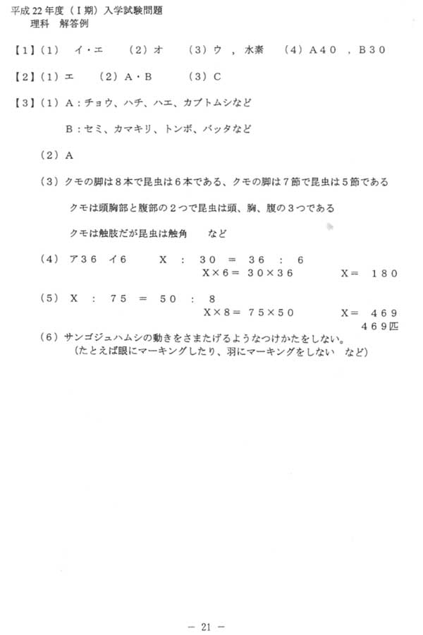 平成22年度入試過去問題 I期入試(理科 解答)(1ページ目)|静岡聖光学院中学校の入試過去問