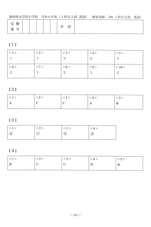 令和6年度入試過去問題 1科目静岡(英語 解答)(1ページ目)|静岡聖光学院中学校の入試過去問
