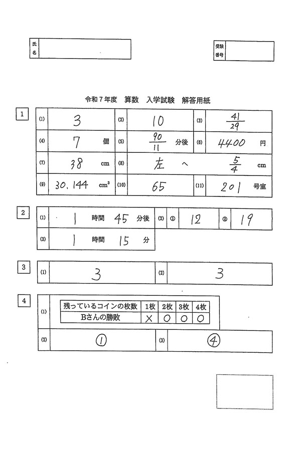 令和7年度入試過去問題(算数 解答)(1ページ目)|愛知中学校の入試過去問