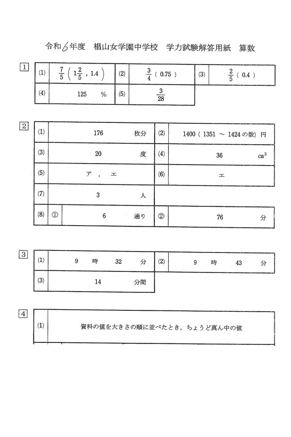 令和6年度入試過去問題(算数 解答)(1ページ目)|椙山女学園中学校の入試過去問