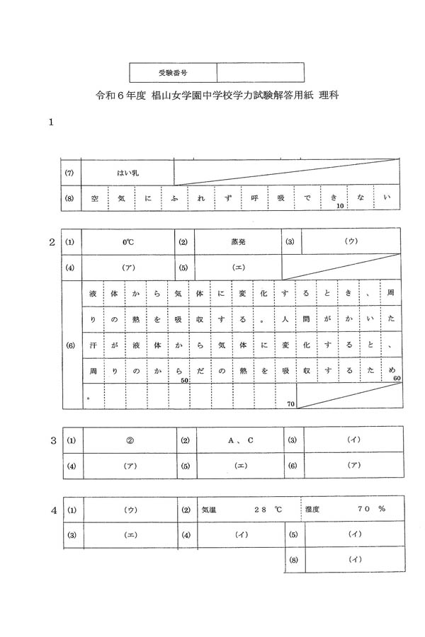 令和6年度入試過去問題(理科 解答)(1ページ目)|椙山女学園中学校の入試過去問